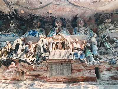 宝顶山固然夺目,亦不掩盖“五山”其他诸山的光芒。历时250余年修建、造像近万尊的北山石刻,展示了晚唐至两宋时期中国民间佛教信仰及石窟艺术风格的发展变化;开凿于北宋的石篆山石刻,儒、释、道造像俱全……大足石刻是本厚重的大书,仅看“摘要”,甚或“三分钟解说”,必成盲人摸象。