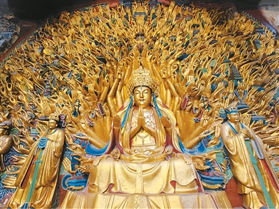 还有那最令人震撼的千手观音像,作为我国最大的集雕刻、贴金、彩绘于一体的摩崖石刻造像,在88平方米的坚硬崖壁上进行立体打刻,雕出的1007只手不光手势无一雷同,而且手中所执法器大都是南宋时期的生活用品、劳动工具等,堪称当时社会风貌的“活字典”,特别是没有一只手在雕刻时被打坏,其艺术创造力之磅礴、雕刻表现力之精湛,让人叹为观止!